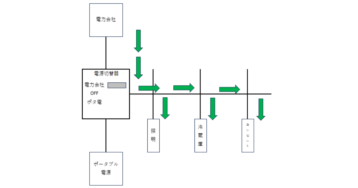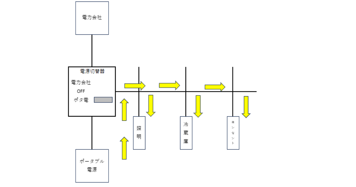 電源切替器を「ポータブル電源」に切替えたときの電気の流れがこちら
